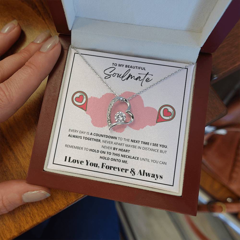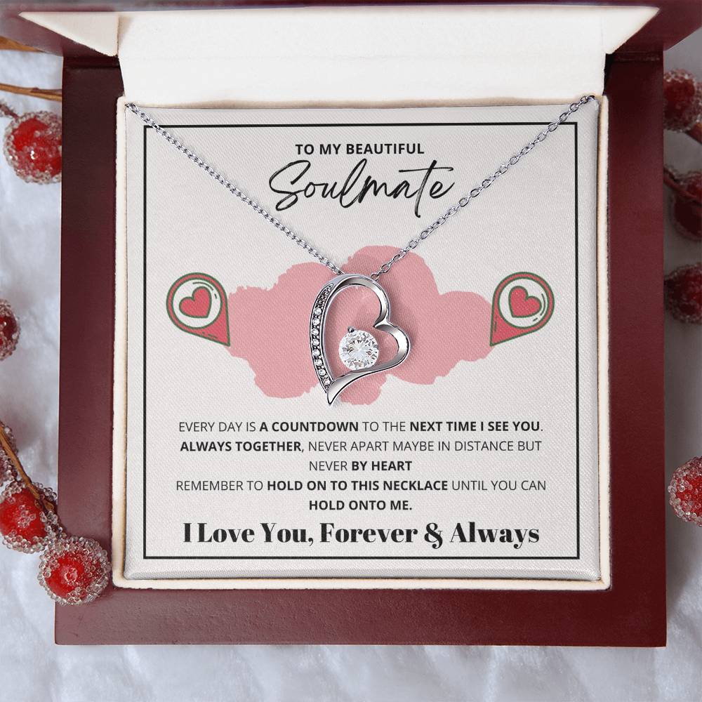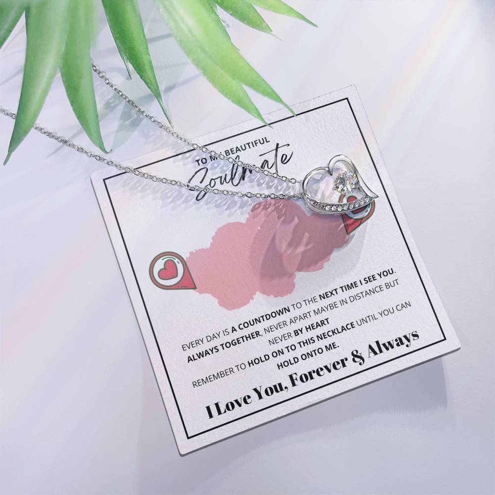 Message on card reads: "Every day is a countdown to the next time I see you. Always together, never apart maybe in distance but never by heart. Remember to hold on to this necklace until you can hold onto me. I Love You, Forever & Always"